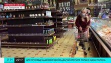 Гастроном "Елисеевский" на Тверской опустел. Тишина в зале, на полках никакого выбора, а в окна заглядывают обеспокоенные москвичи.