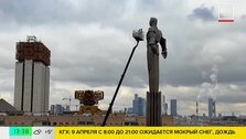 В преддверии Дня космонавтики в Москве промывают памятник Юрию Гагарину. Для этого бригада коммунальных служб поднялась на автовышке на высоту 50 метров и подключила моющую установку высокого давления.