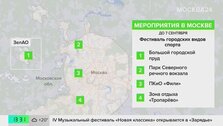 В парке имени Юрия Лужкова организованы соревнования по скейтбордингу. В саду "Эрмитаж" можно посетить тренировку по энергойоге с медитативными и вокальными практиками. На пляже № 3 в Серебряном бору проходят занятия по стретчингу с опытными инструкторами.