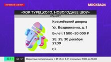 Еще вечером 30 декабря в Государственном кремлевском дворце москвичи могут послушать хор Турецкого. В новогоднем концерте арт-группы прозвучат лучшие песни из мировой коллекции новогодних и рождественских хитов в авторских аранжировках.