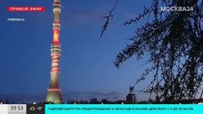 На Останкинской телебашне разместили сразу несколько световых открыток. Герб России сменяется красной звездой с георгиевской лентой.