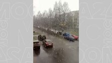 В Архангельск выпал снег. Распустившиеся деревья и уже зеленые газоны укрыло белым полотном.