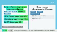 На каток можно отправиться в конноспортивный комплекс "Битца". Там есть сеансы в 17:30, 19:00 и 20:05. Такие же тренировки есть и в столичных парках "Останкино" и "Митино". Они начинаются в 19:00 и 20:30.