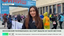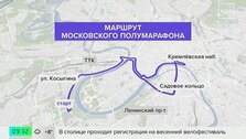 Участники Московского полумарафона бегут больше 2 часов. Маршрут пролегает вдоль МГУ, Кремля, храма Василия Блаженного, Крымского моста, храма Христа Спасителя и памятника Петру I и завершится в "Лужниках". Большинство участников преодолели около половины дистанции, а самые быстрые уже финишировали.