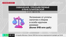 Отмечается, что Блиновской предъявили обвинение в уклонении от уплаты налогов на сумму более 918 миллионов рублей. Подробнее – в эфире телеканала Москва 24.