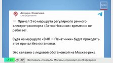 Маршрут "ЗИЛ" – "Печатники" речной транспорт проходит без остановки. Ограничение связано с ледовой обстановкой на Москве-реке. Подробнее – в эфире телеканала Москва 24.