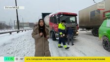 Большегрузам на подъездах и съездах на МКАД помогает техника ЦОДД. Они вытягивают застрявшие фуры и освобождают дорогу.