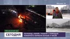 Пламя тушили более четырех часов с привлечением противопожарного корабля. Что сейчас происходит на Нагатинской набережной – в сюжете телеканала Москва 24.