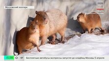 Семейство капибар вышло на весеннюю прогулку в Московском зоопарке. В столице потеплело, и животные начали выбираться на улицу из павильонов.
